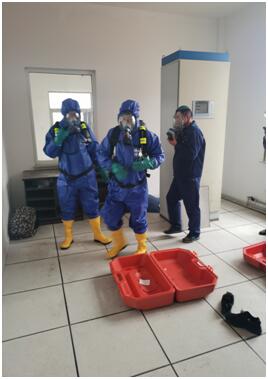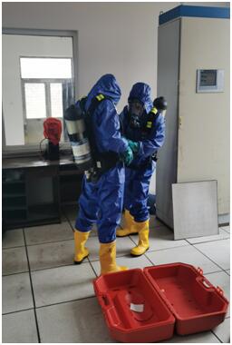 泄氯應急操作演習事前并未提前通知相關人員,系人工觸動泄氯報警裝置,警鈴響起后,三灣運轉值班人員立即到達氯氣車間,泄氯回收裝置已自動開啟,同時通知水廠和三灣凈化班組,穿著連體防護服并佩戴好壓縮空氣呼吸器,三灣凈化班組值班人員佩戴活性炭防護面罩到達氯氣車間參與應急搶修。
